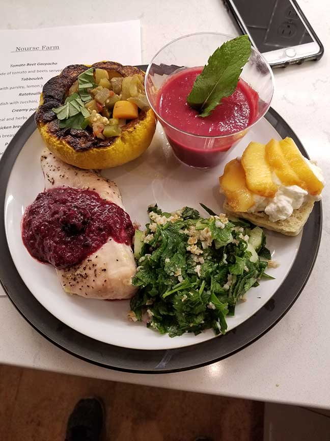 Here are the finished products from the farm adventures I had last month. The top left dish is tabbouleh made with parsley (currently in season in New England). Next, we have a plate that encompassed all of the dishes from the rest of the night. A baked chicken topped with seasonal berry compote. Patty pan squash stuffed with ratatouille. Beet and tomato gazpacho. And for dessert sweet biscuit with fresh whipped cream and fresh peaches with basil water.