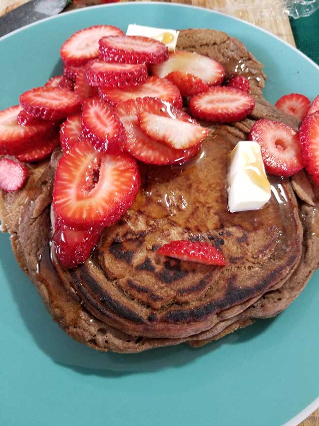 Last weekend for mother’s day we had chocolate pancakes! Packed with pea protein powder, these pancakes were very satisfying and curbed every sweet craving. We topped these off with fresh strawberries, butter and honey.