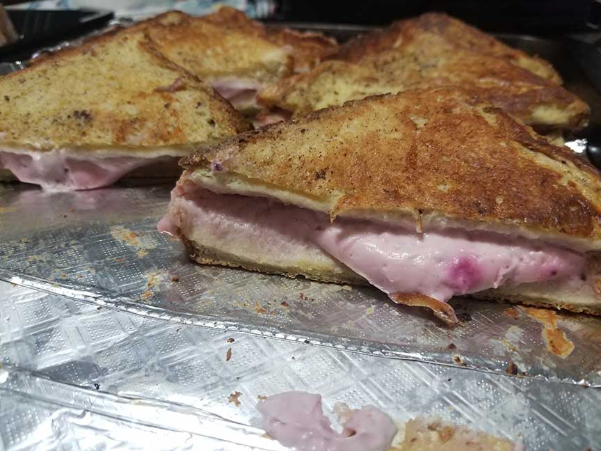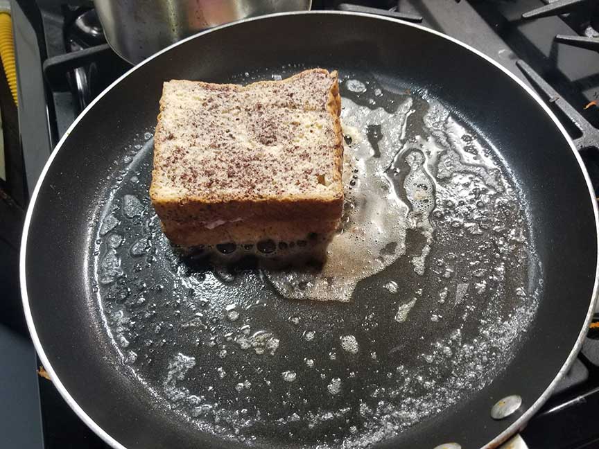 - Dip sandwich in the egg batter and begin to cook bread. About 4 mins each side.